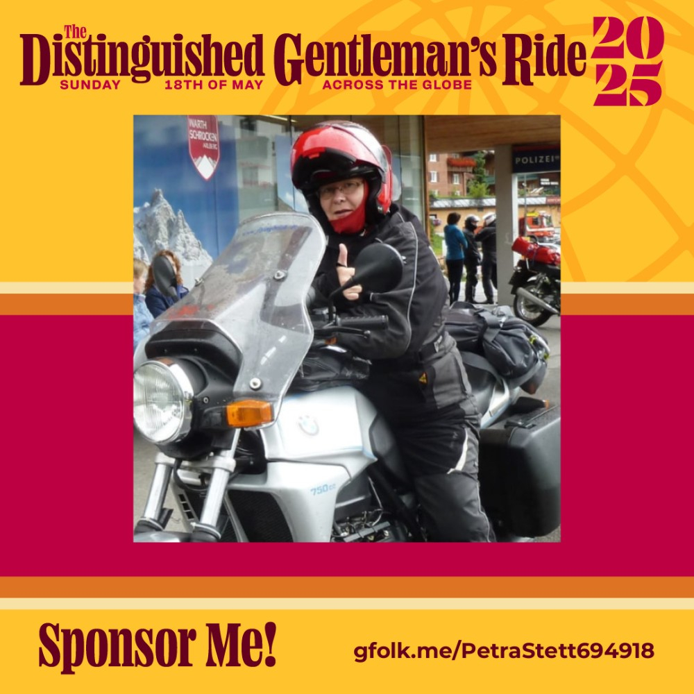 Am Sonntag, dem 18. Mai 2025, nehme ich zusammen mit anderen Männern und Frauen aus aller Welt am "The Distinguished Gentleman's Ride" teil, um im Namen des Movember Geldmittel und Bewusstsein für Prostatakrebs und die psychische Gesundheit von Männern zu sammeln.